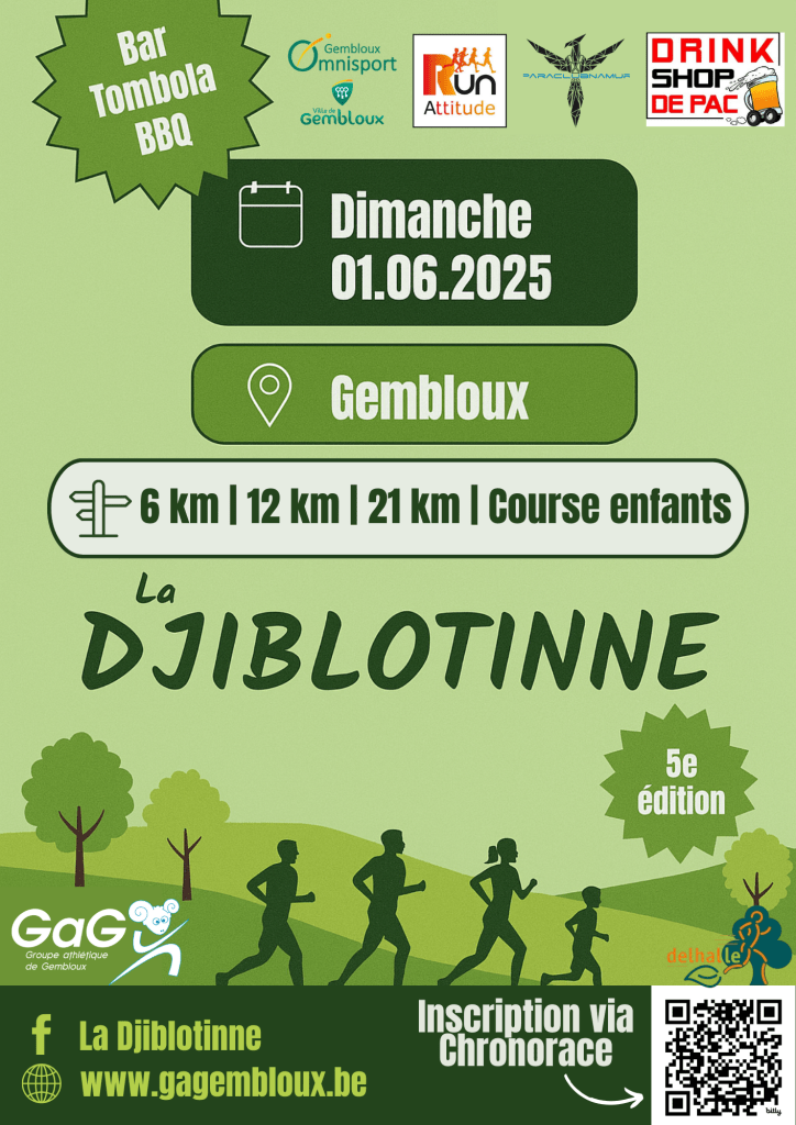 Chers sportifs, réservez le dimanche 1er juin pour la nouvelle édition de la Djiblotinne (21 km), de la Douce Djiblotinne (12 km), Mini-Djiblotinne (6 km), ainsi qu’une course enfants (1 km) !